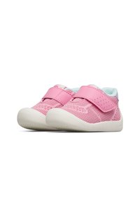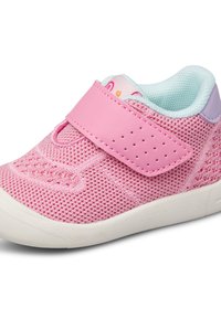 Pinkfarbener Kleinkind-Sneaker mit atmungsaktivem Mesh, einem Klettverschluss, weißer Sohle und lila Fersenpatch, seitlich links vor weißem Hintergrund gezeigt.