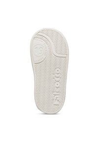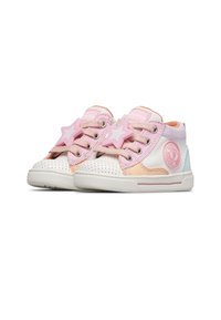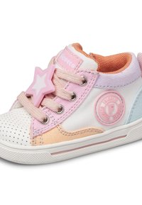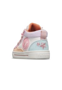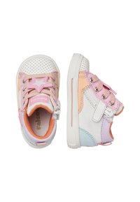 Kleinkind-Hochschnitt-Sneaker in Weiß mit pastellrosa, Pfirsich- und blauen Akzenten, pinken Schnürsenkeln und einem runden Logo-Patch an der Seite.