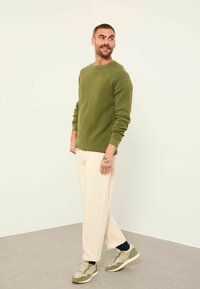 Olivgrüner, gerippter Pullover mit langen Ärmeln und Rundhalsausschnitt, über einem hellrosa Hemd getragen, kombiniert mit cremefarbenen Hosen.