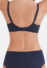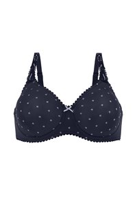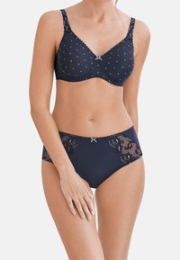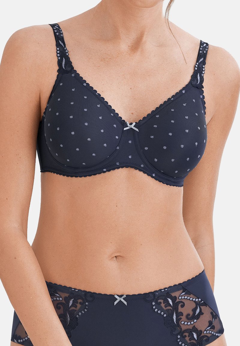 Marineblauer BH mit hellen Tupfen und spitzenbesetzten Trägern, kombiniert mit passender marineblauer hochtaillierter Unterwäsche mit Spitze und Stickerei.