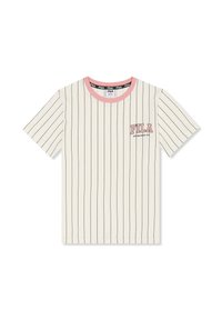 Weißes T-Shirt mit kurzen Ärmeln, dünnen schwarzen vertikalen Streifen, rosa Kragen und rosa "FILA"-Logo mit dem Text "Established 1911" auf der Brust.