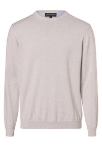 Dunkelblauer Strickpullover, Rundhalsausschnitt, lange Ärmel, gerippte Bündchen und Saum, aus weichem Stoff mit glatter Textur. Keine Muster oder Akzente.