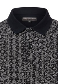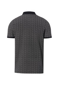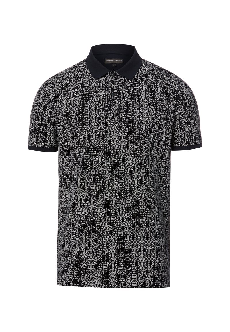 Schwarzes Poloshirt mit kurzen Ärmeln, weißem geometrischem Muster und einfarbigem schwarzem Kragen sowie Ärmelbündchen.