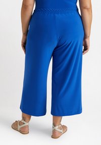 Blaue, weit geschnittene Culottes aus leichtem Stoff mit glatter Textur, ausgestattet mit Seitentaschen und einem taillierten Bund.