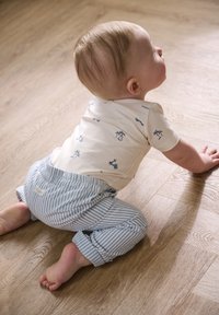 Baby mit hellem Haar, das ein weißes Shirt mit blauen Drucken und blau gestreifte Hosen trägt, krabbelt auf einem Holzboden.