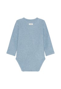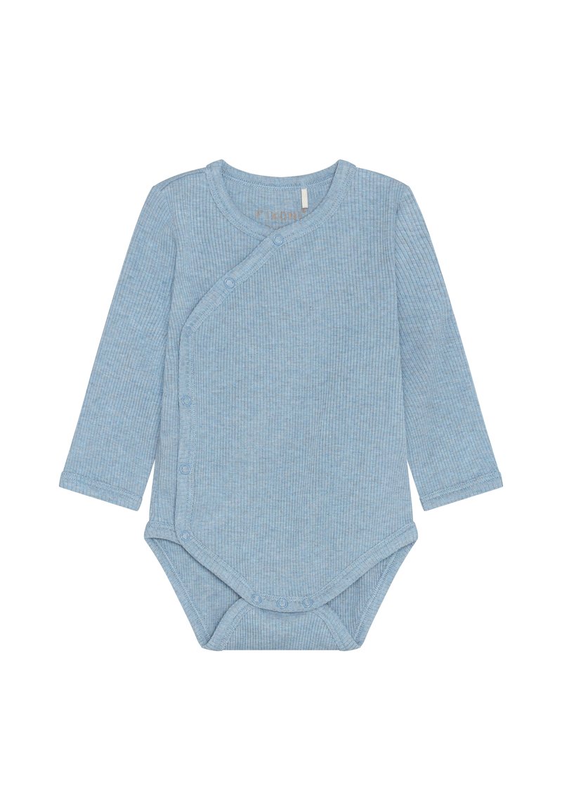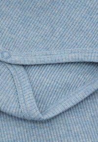 Baby-Body mit langen Ärmeln aus hellblauem Rippstoff, mit überlappendem Vorderteil, Druckknöpfen und rundem Ausschnitt.