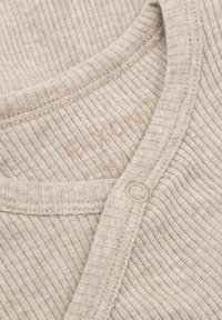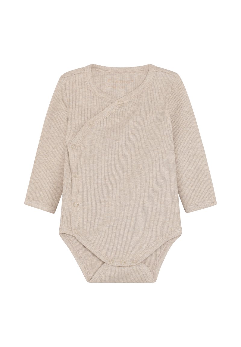 Langärmliger Baby-Body aus hellbeigem Rippstoff mit Wickeloptik und Druckknöpfen für einfaches An- und Ausziehen. Weiche Textur, minimalistische Details.