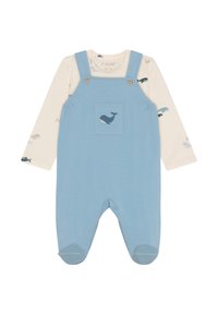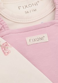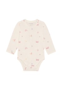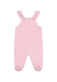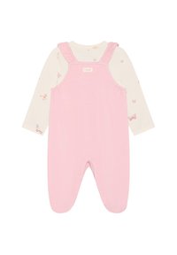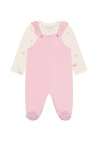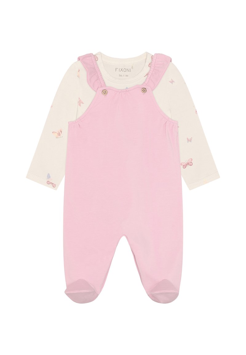 Langärmliger cremefarbener Baby-Body mit Schmetterlingsdruck unter einem rosa ärmellosen, gerafften Strampler mit Knopfträgern und Füßchen.
