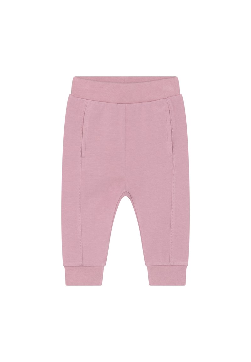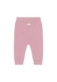 Rosa Baumwoll-Jogginghosen mit einem elastischen Bund, zwei Seitentaschen, konisch zulaufenden Beinen und gerippten Bündchen. Glatte Textur und schlichtes Design.