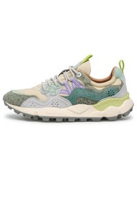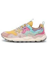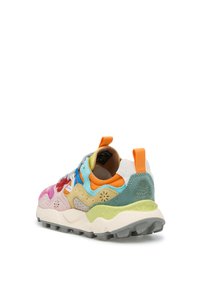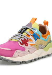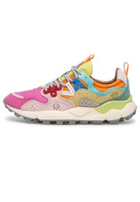 Person trägt weiße, weit geschnittene Hosen und bunte Sneakers mit pinken, blauen, orangen und grünen Akzenten, steht auf einem hellgrauen Boden.