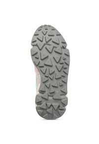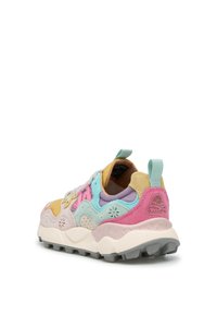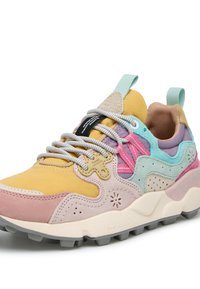 Beine in dunkelblauen Schlagjeans und bunten Sneakern mit gelben, pinken und weißen Akzenten auf einem grauen Boden.