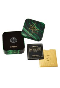 -Zifferblatt: Quadratisches goldfarbenes Edelstahlgehäuse mit grünem Sunray-Zifferblatt.
