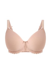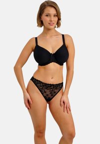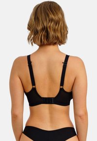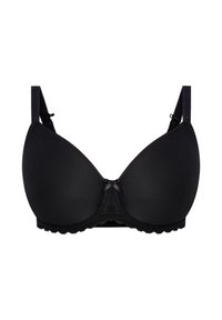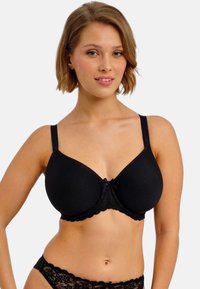 Schwarzer BH mit gepolsterten Cups, verstellbaren Trägern, Spitzenbesatz und einer kleinen Schleife in der Mitte. Glatte Textur, für Halt konzipiert.