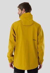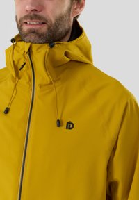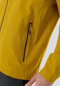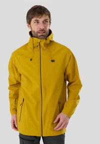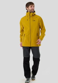 Mann trägt eine senfgelbe wasserdichte Jacke mit Frontreißverschluss und schwarze Hose, blickt leicht nach links vor grauem Hintergrund.