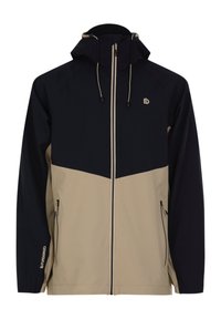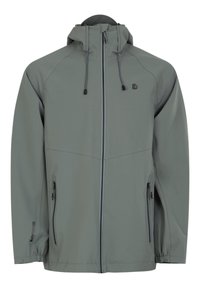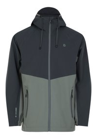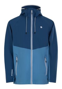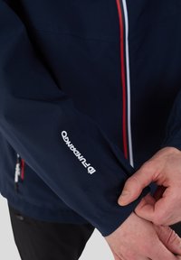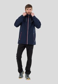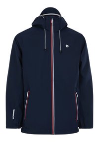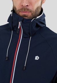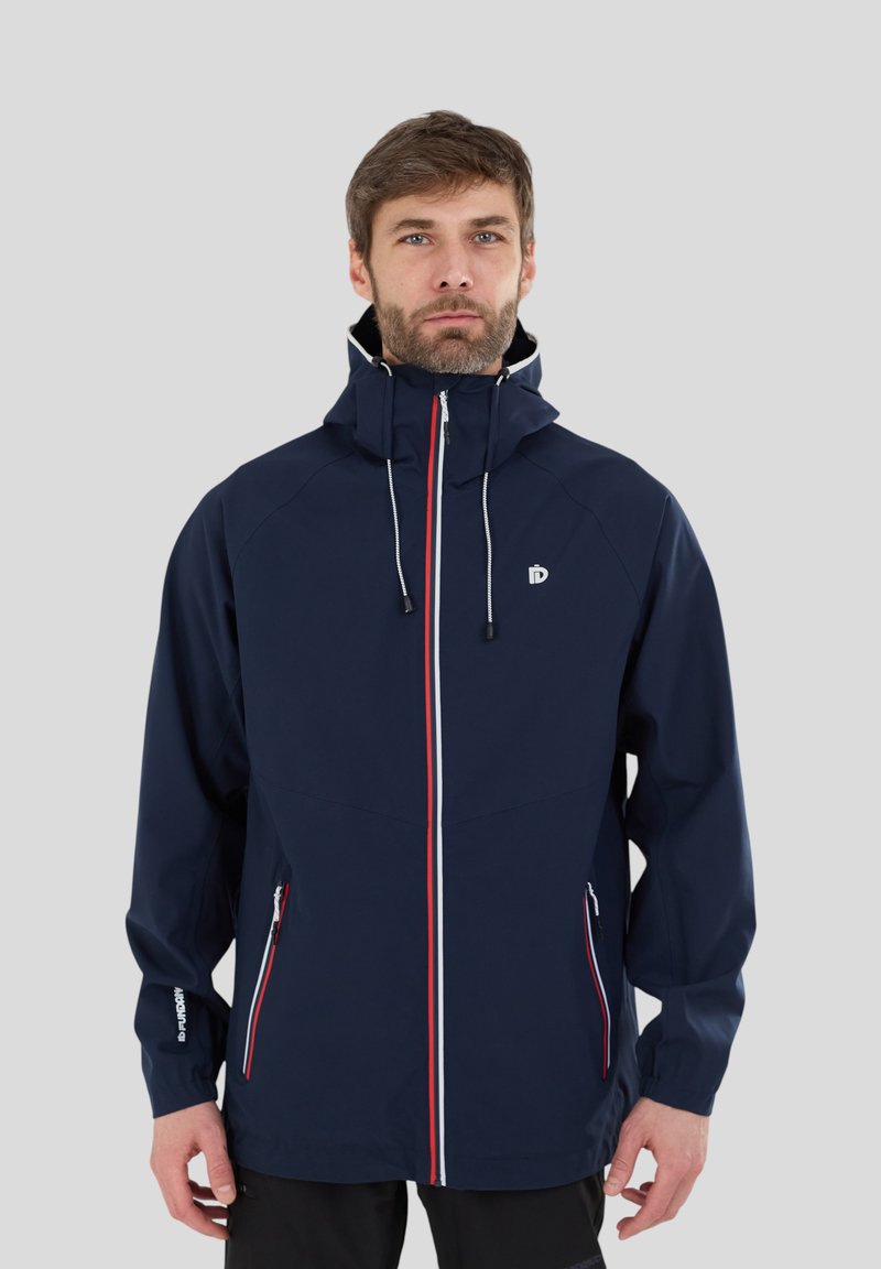 Mann trägt eine marineblaue Kapuzenjacke mit roten und weißen Reißverschlussakzenten, steht vor einem schlichten grauen Hintergrund.