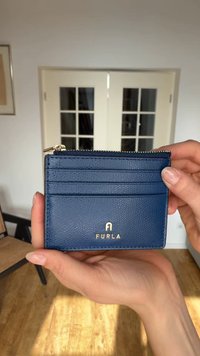 Dunkelblauer Kartenhalter aus Leder mit mehreren Kartenfächern, einem Reißverschlusstasche und einem goldenen Logo-Akzent unten in der Mitte. Glatte Textur.