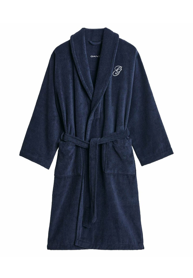 Marineblauer Frottierbademantel mit langen Ärmeln, Schalkragen, Gürtel und zwei vorderen Taschen. Verfügt über ein auf der Brust gesticktes Logo.