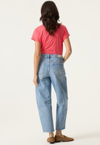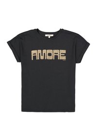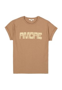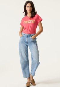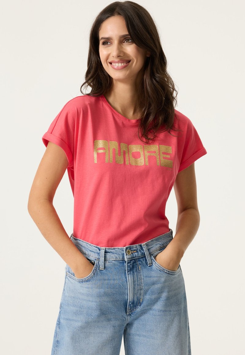 Korallenrosa T-Shirt mit metallisch goldfarbenem "AMORE"-Schriftzug, kurzen aufgerollten Ärmeln und lockerem Schnitt. Kombiniert mit hoch taillierten blauen Jeans.