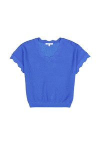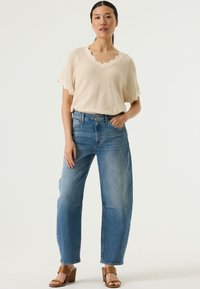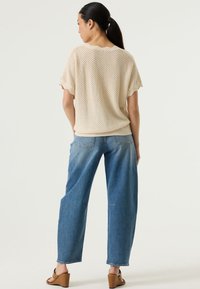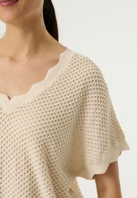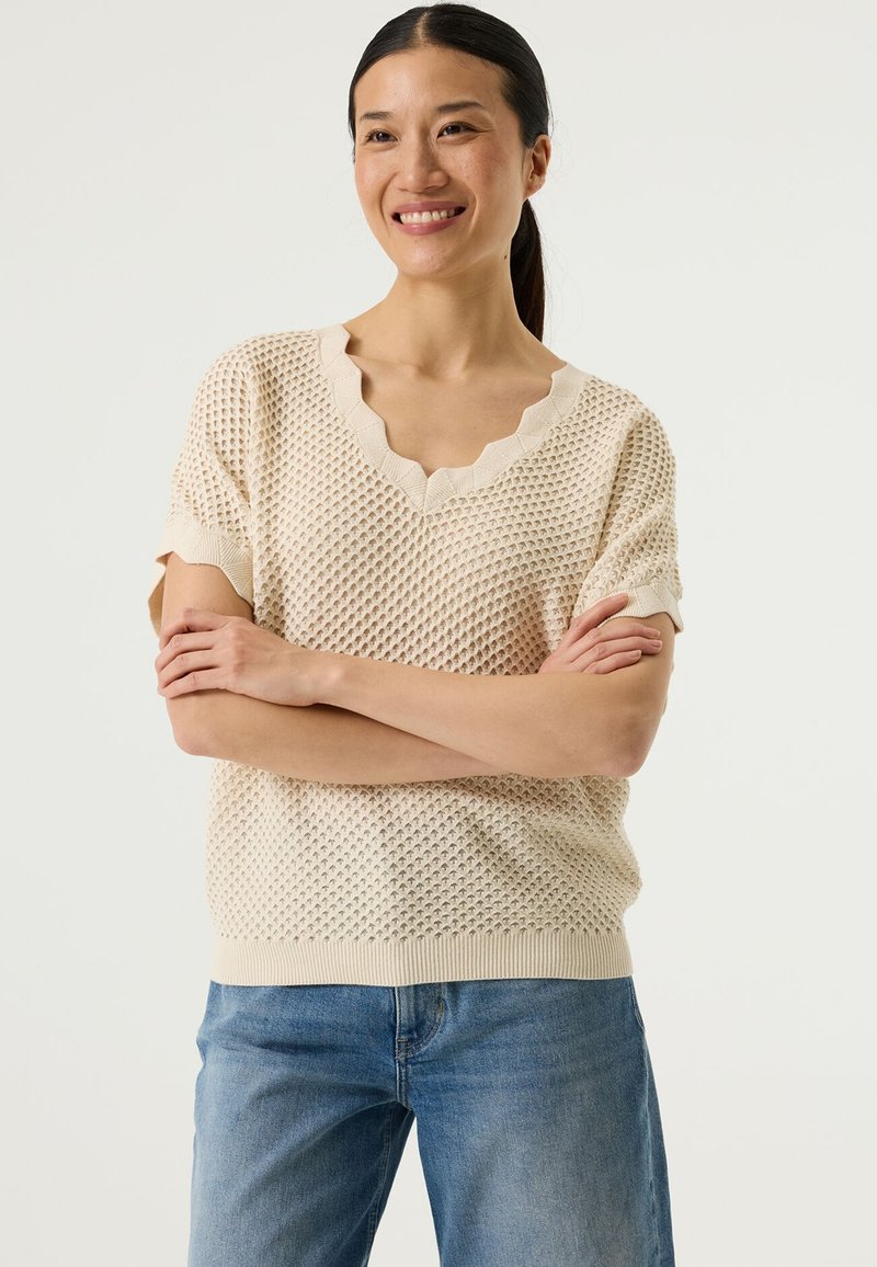 Beiger Strickpullover mit einer strukturierten, offenen Strickoptik, schalkragenähnlichem V-Ausschnitt und kurzen Ärmeln, kombiniert mit hellblauen Jeans.