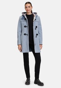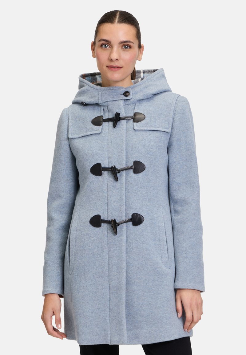 Hellblauer Dufflecoat aus einem Wollmischgewebe, große Kapuze, schwarze Knopfverschlüsse, zwei seitliche Taschen, dezente kariierte Fütterung.