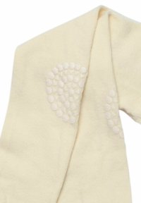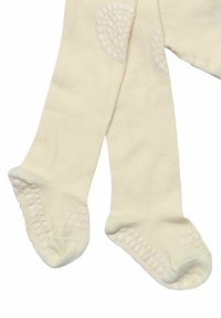 Kinderstrumpfhose in Cremefarbe mit rutschfesten Griffen an Füßen und Knien, flach auf einem weißen Hintergrund ausgelegt.