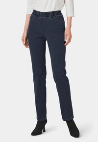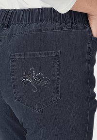 Dunkelblaue Jeans aus Denim mit elastischem Bund. Fünf-Taschen-Design mit geradem Bein. Das Material scheint weich mit leichter Textur zu sein.