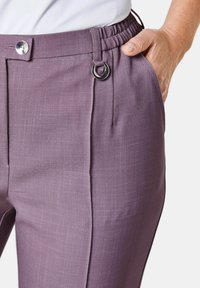 Hoch taillierte Hose aus leicht lila Stoff mit strukturiertem Muster, ausgestattet mit Vorderfalten, seitlichen Taschen und einem Bund mit Gürtel Schlaufen und Knopfverschluss.