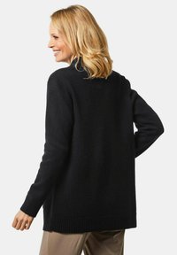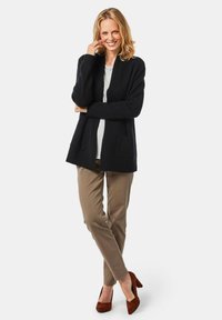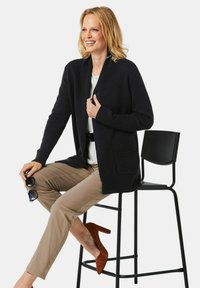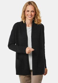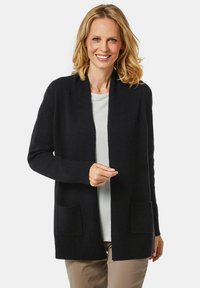 Schwarze, langärmelige Strickjacke aus weichem Stoff mit offener Vorderseite, gerippten Bündchen und zwei Vordertaschen.