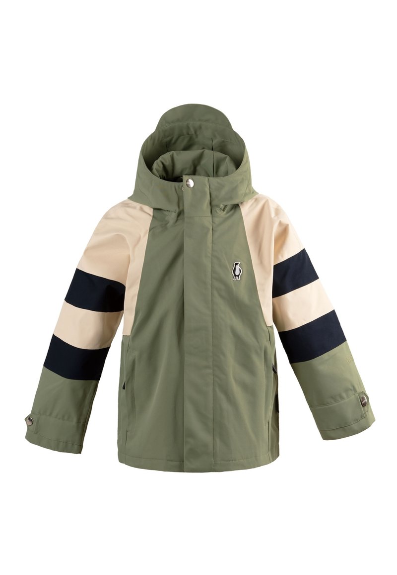 Kinder-Kapuzenjacke mit olivgrünem Körper, beigen oberen Ärmeln und schwarzen Streifen an den Armen, mit einem kleinen Pinguin-Logo auf der Brust.