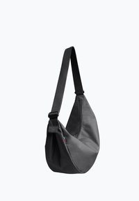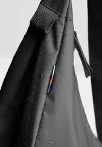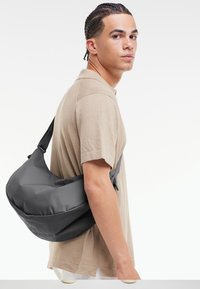 Blonde Frau in beigem ärmellosem Oberteil hält schwarze Umhängetasche mit "GOT BAG"-Logo vor weißem Hintergrund.