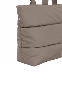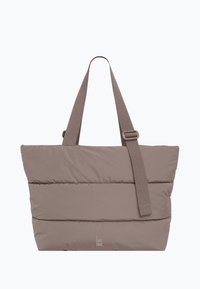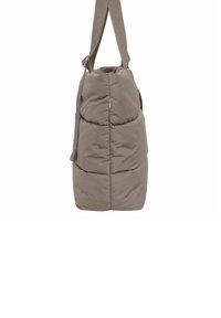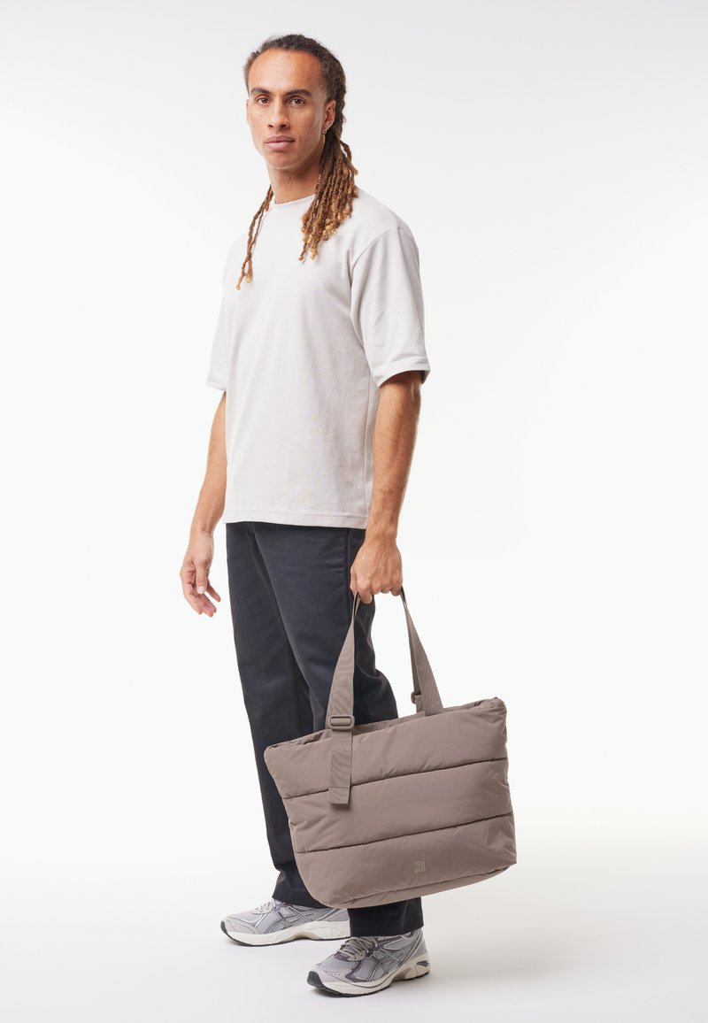 Mann mit langem, geflochtenem Haar steht und hält eine große, gepolsterte Tasche in Taupe, trägt ein hellgraues T-Shirt, dunkle Hosen und graue Sneaker vor weißem Hintergrund.