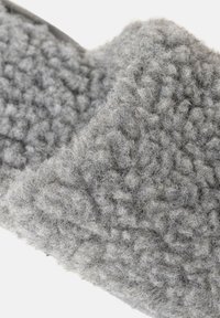 Grauer Hausschuh mit flauschigem Obermaterial, weichem Material, offenem Rücken und flacher grauer Sohle. Keine Muster oder zusätzlichen Akzente sichtbar.