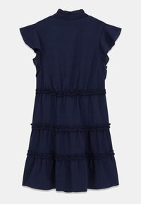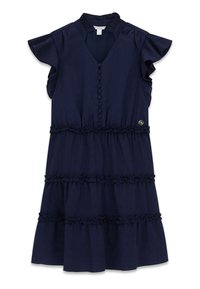 Dunkel marineblaues ärmelloses Kleid mit gestuften Rüschen, stoffbezogenen Knöpfen vorne und einem kleinen metallischen Logo in der Taille.