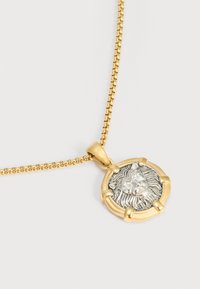 Goldkette mit rundem Anhänger, der ein detailliertes silbernes Löwenkopf-Design zeigt.