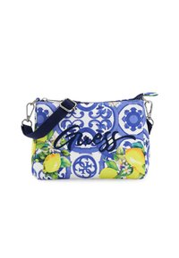 Rosa Umhängetasche mit tropischen Blumen und "Guess"-Logo, verstellbarem Riemen und Reißverschluss, die vor einem einfarbigen Hintergrund hängt.