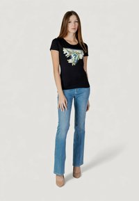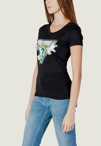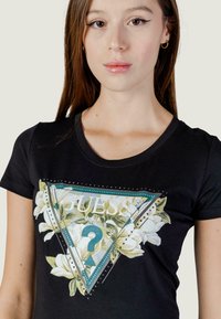 Schwarzes T-Shirt mit einem dreieckigen Aufdruck, der florale Akzente und das Wort "GUESS" zeigt. Kurze Ärmel und ein rundes Halsbündchen.