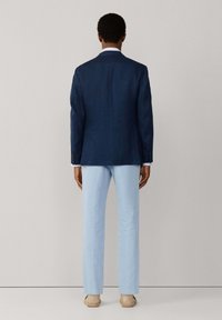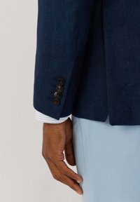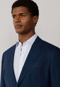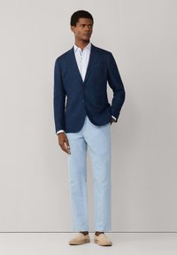 Mann trägt ein marineblaues Sakko, hellblau gestreiftes Hemd und hellblaue Hose, steht vor einem schlichten hellgrauen Hintergrund.