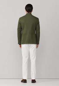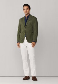 Mann trägt ein olivgrünes Sakko über einem marineblauen Hemd mit Knöpfen und weiße Hose, steht vor einem schlichten hellgrauen Hintergrund.