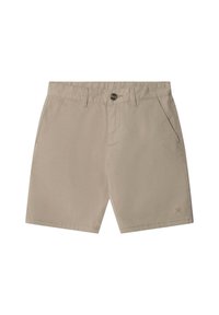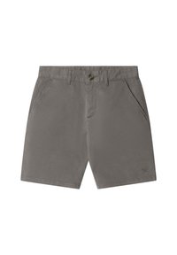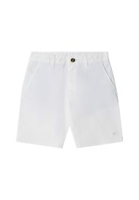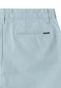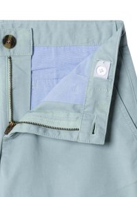 Hellblaue Herren-Shorts mit Fronttaschen, Gürtelschlaufen und Knopfverschluss, schlichtes Design mit kleinem Logo nahe dem Saum.