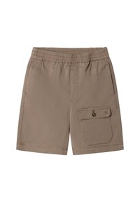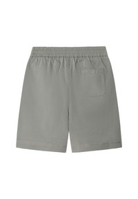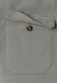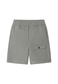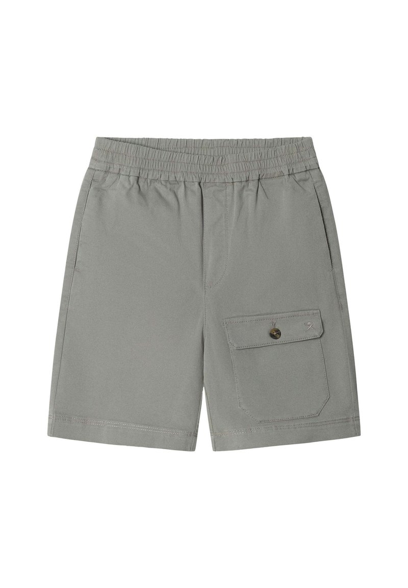 Graue Shorts mit elastischem Bund, einer geknöpften Klappentasche auf der rechten Seite und zwei Seitentaschen.