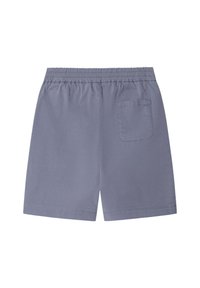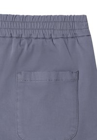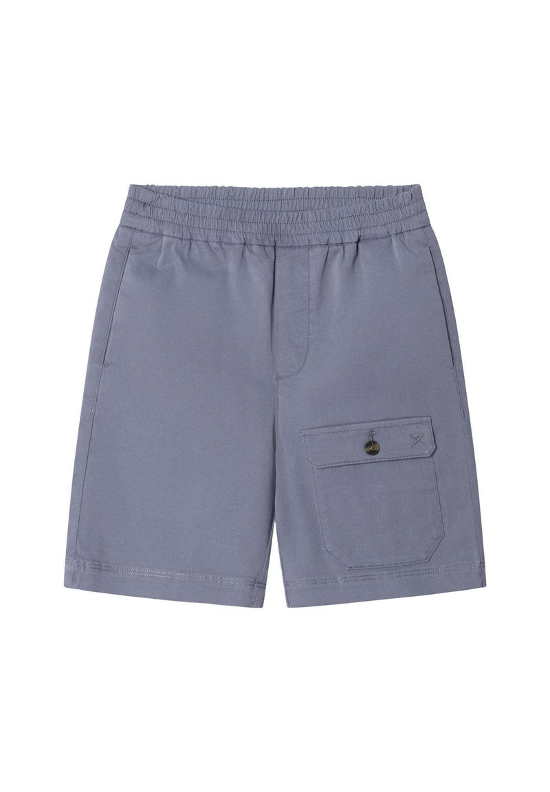 Graue Freizeithosen mit elastischem Bund, Seitentaschen und einer mit Knopf verschlossenen Klappentasche am rechten Bein.