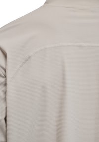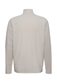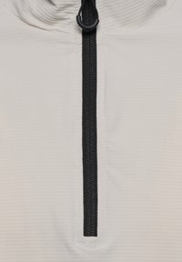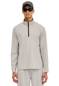 Leichter, langärmeliger Pullover aus hellgrauem Stoff mit einem Viertel-Reißverschluss und einer strukturierten Oberfläche. Getragen mit passenden Hosen und einer Mütze.