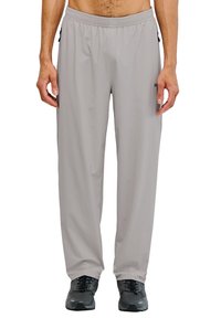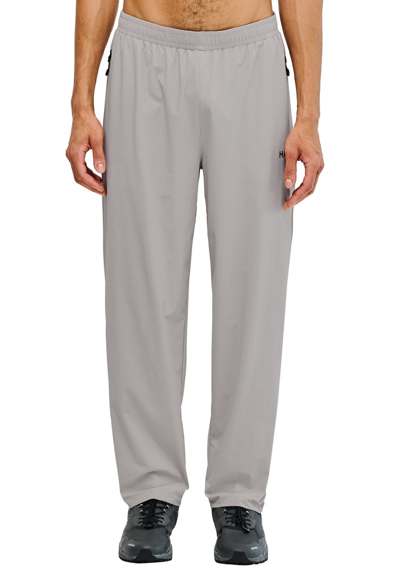Mann trägt hellgraue elastische Hosen mit Seitentaschen und schwarzen Sportschuhen, stehend vor weißem Hintergrund.