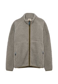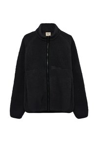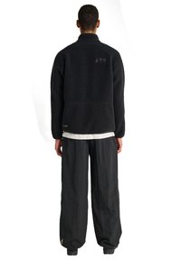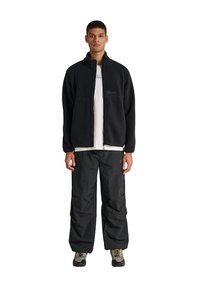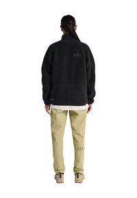Zwei Models tragen schwarze Fleecejacken; eines zeigt die Vorderseite mit schwarzer Hose, das andere die Rückseite mit khakifarbener Hose und beigen Schuhen.