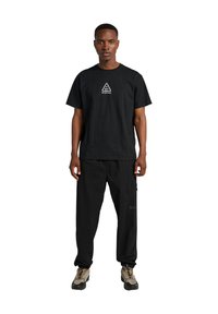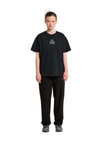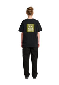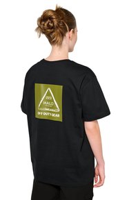 Mann trägt ein schwarzes T-Shirt mit grünem Dreieck-Logo und dem Schriftzug "HALO 223 OFF DUTY GEAR" auf dem Rücken, kombiniert mit schwarzer Hose und Turnschuhen.