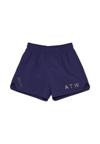 Kurze graue Shorts mit Gummibund und gelbem "ATW"-Aufdruck auf der Vorderseite, kombiniert mit dunklen Schuhen und weißen Socken mit goldener Schrift.