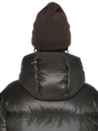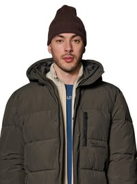 Mann trägt braune gestrickte Mütze, dunkel olivgrüne Steppjacke mit Reißverschluss und Druckknöpfen, beige Jacke und blaues Hemd darunter.