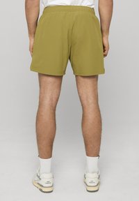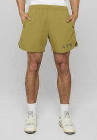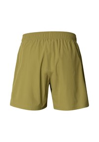 Mann steht mit dem Gesicht nach vorne, trägt ein olivgrünes kurzärmeliges Hemd, passende Shorts, schwarze Socken und Wanderschuhe vor grauem Hintergrund.