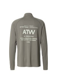 Mann trägt graues, strukturiertes Langarmshirt mit der Aufschrift "ATW All Terrain Wear" und zusätzlichem Text auf der Rückseite.