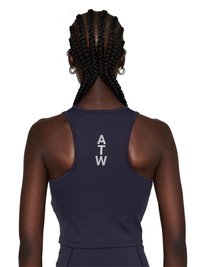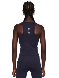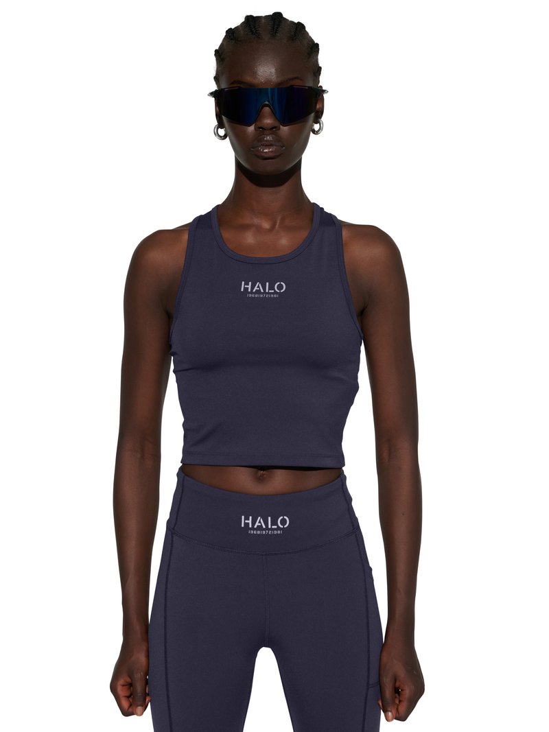 Frau trägt ein dunkles sportliches Crop-Top und Leggings mit dem "HALO"-Logo, große schwarze Sonnenbrille und silberne Creolen, steht vor weißem Hintergrund.